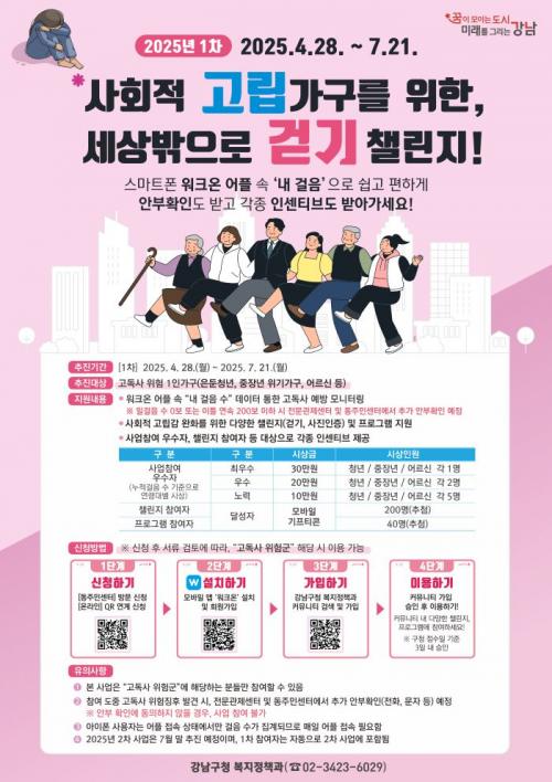 [½Åµ¿¾Æ¹æ¼Û °­³²±¸=À̽ŵ¿±âÀÚ] ²ÞÀÌ ¸ðÀÌ´Â µµ½Ã, ¹Ì·¡¸¦ ±×¸®´Â °­³²±¸°¡ ¿À´Â 4¿ù 28ÀϺÎÅÍ Àü±¹ ÃÖÃÊ·Î ½º¸¶Æ®Æù °È±â ¾ÛÀ» Ȱ¿ëÇØ °í¸³ À§Çè¿¡ ³õÀΠû³â°ú ÁßÀå³â 1ÀÎ °¡±¸ÀÇ ¾ÈºÎ¸¦ È®ÀÎÇÏ´Â ¡®ÀºµÐ °íµ¶»ç À§Çè°¡±¸ ¼¼»ó¹ÛÀ¸·Î »ç¾÷¡¯À» ÃßÁøÇÑ´Ù. À̹ø »ç¾÷¡¦