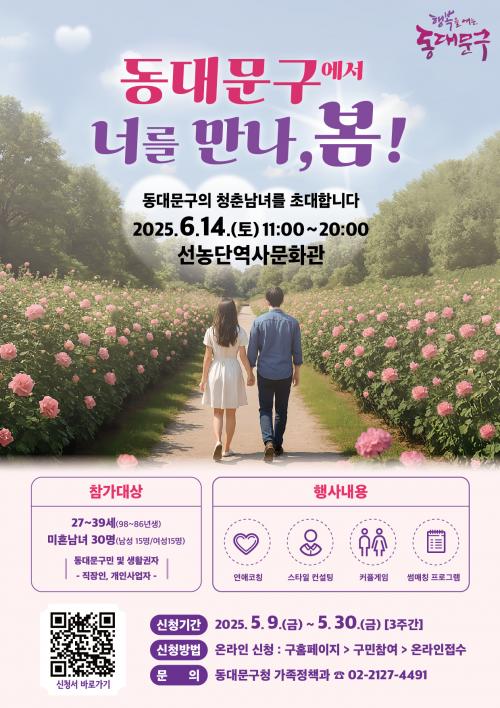 [½Åµ¿¾Æ¹æ¼Û µ¿´ë¹®±¸=À̽ŵ¿±âÀÚ] ¼­¿ï µ¿´ë¹®±¸´Â ¿À´Â 6¿ù 14ÀÏ(Åä) ¼±³ó´Ü¿ª»ç¹®È­°ü¿¡¼­ ¹ÌÈ¥ ûÃáÀ» À§ÇÑ ¿¬¾Ö ÄÚĪ ¹× ¸¸³² Çà»ç ¡®µ¿´ë¹®±¸¿¡¼­ ³Ê¸¦ ¸¸³ª, º½!¡¯À» °³ÃÖÇÑ´Ù. À̹ø Çà»ç´Â ¹Ù»Û ÀÏ»ó ¼Ó¿¡¼­ À̼º°úÀÇ ¸¸³²ÀÌ ½±Áö ¾ÊÀº û³âµéÀÌ °Ç°­ÇÑ ¿¬¾Ö¡¦