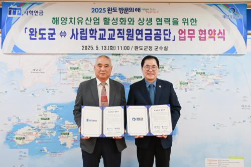 [½Åµ¿¾Æ¹æ¼Û ¿Ïµµ=À̼±Á¾ ±âÀÚ] ¿Ïµµ±º(±º¼ö ½Å¿ìö)ÀÌ »ç¸³Çб³±³Á÷¿ø¿¬±Ý°ø´Ü(ÀÌ»çÀå ¼ÛÇÏÁß, ÀÌÇÏ »çÇבּÝ)°ú ¼ÕÀ» Àâ°í ÇØ¾çÄ¡À¯»ê¾÷ Ȱ¼ºÈ­ ¹× »çÇп¬±Ý ȸ¿ø¡¤°¡Á·ÀÇ º¹Áö ÁõÁø Áö¿øÀ» À§ÇÑ ¾÷¹« Çù¾àÀ» ü°áÇß´Ù. Çù¾à½ÄÀº Áö³­ 5¿ù 13ÀÏ ¿Ïµµ±ºÃ»¿¡¡¦