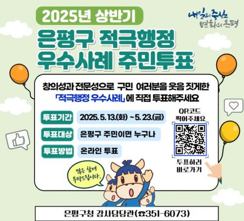 [½Åµ¿¾Æ¹æ¼Û ÀºÆò±¸=À̽ŵ¿±âÀÚ] ¼­¿ï ÀºÆò±¸´Â Áö¿ª ¹ßÀü°ú ±¸¹Î »îÀÇ Áú Çâ»óÀ» À§ÇØ ÁֹεéÀÌ Ã¼°¨ÇÑ Àû±ØÇàÁ¤À» ¿ì¼ö»ç·Ê¿¡ ´ëÇØ ÁÖ¹ÎÅõÇ¥¸¦ ½Ç½ÃÇÑ´Ù°í ¹àÇû´Ù. À̹ø ÅõÇ¥´Â ±¸¹ÎÀÌ Á÷Á¢ Âü¿©ÇØ °ø¹«¿øÀÇ Àû±ØÇàÁ¤ ¼º°ú¸¦ Æò°¡Çϰí, ÀÏ ÀßÇÏ´Â °ø¹«¿øÀ» ÀÀ¿øÇϴ¡¦