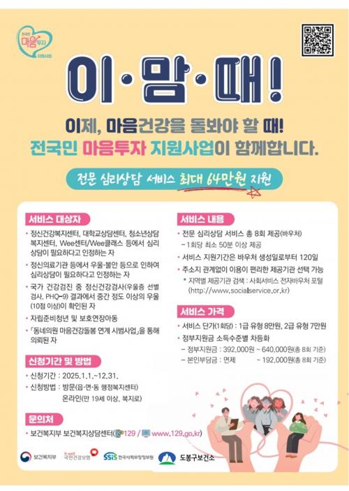 [½Åµ¿¾Æ¹æ¼Û µµºÀ±¸=À̽ŵ¿±âÀÚ] ¼­¿ï µµºÀ±¸°¡ Áö³­ÇØ¿¡ ÀÌ¾î ¿ÃÇØµµ ¡®Àü±¹¹Î ¸¶À½ÅõÀÚ Áö¿ø»ç¾÷¡¯°ú ¡®¸¶À½°Ç°­°ËÁø ¹× »ó´ãÁö¿ø»ç¾÷¡¯À» ½Ç½ÃÇÑ´Ù. ¡®Àü±¹¹Î ¸¶À½ ÅõÀÚ Áö¿ø»ç¾÷¡¯Àº ¿ì¿ï, ºÒ¾È µî Á¤¼­Àû ¾î·Á¿òÀÌ ÀÖ´Â ±¸¹Î¿¡°Ô Àü¹® ½É¸®»ó´ã ¼­ºñ½º¸¦ ¹ÞÀ» ¡¦