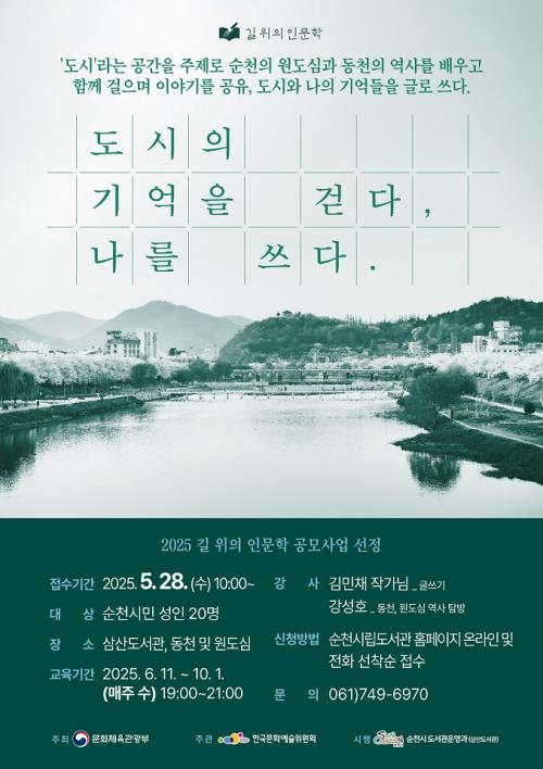 [½Åµ¿¾Æ¹æ¼Û ¼øÃµ=±è¿ëÈÆ ±âÀÚ] ¼øÃµ½Ã(½ÃÀå ³ë°ü±Ô)´Â ¹®È­Ã¼À°°ü±¤ºÎ°¡ ÁÖÃÖÇϰí Çѱ¹¹®È­¿¹¼úÀ§¿øÈ¸°¡ ÁÖ°üÇÏ´Â ¡®2025³â ±æ À§ÀÇ Àι®ÇС¯ °ø¸ð»ç¾÷¿¡ ¼±Á¤µÇ¾î, ޹æ, °­¿¬, ±Û¾²±â µîÀ» ³»¿ëÀ¸·Î ÇÏ´Â º¹ÇÕÇü Àι®ÇÐ °­Á ¡¸µµ½ÃÀÇ ±â¾ïÀ» °È´Ù, ³ª¸¦ ¾²´Ù¡¹¸¦ ¿À¡¦