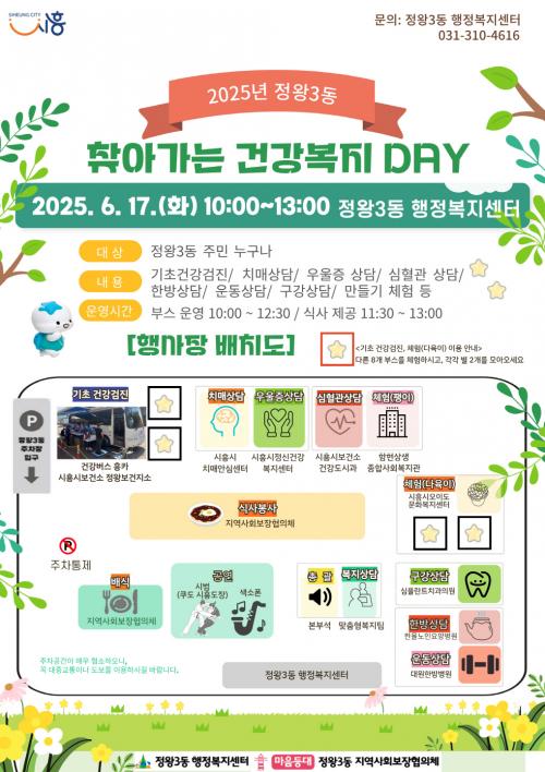 [½Åµ¿¾Æ¹æ¼Û ½ÃÈï½Ã=À̽ŵ¿±âÀÚ] ½ÃÈï½Ã Á¤¿Õ3µ¿ Áö¿ª»çȸº¸ÀåÇùÀÇü´Â ¿À´Â 6¿ù 17ÀÏ ¿ÀÀü 10½ÃºÎÅÍ ¿ÀÈÄ 1½Ã±îÁö, Á¤¿Õ3µ¿ ÇàÁ¤º¹Áö¼¾ÅÍ ÁÖÂ÷Àå¿¡¼­ ¡®2025³â ã¾Æ°¡´Â °Ç°­º¹Áöµ¥ÀÌ¡¯¸¦ °³ÃÖÇÑ´Ù. À̹ø Çà»ç¿¡´Â ÁֹΠ´©±¸³ª Âü¿©ÇÒ ¼ö ÀÖ´Ù. ¡®Ã£¾Æ°¡´Â °Ç°­º¹Áö¡¦