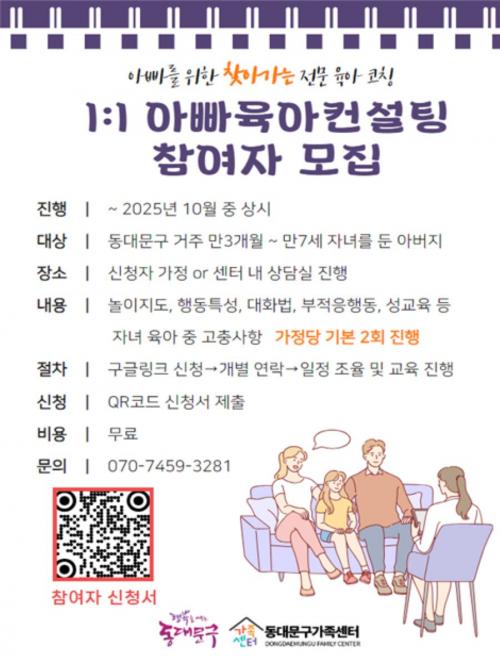 [½Åµ¿¾Æ¹æ¼Û µ¿´ë¹®±¸=À̽ŵ¿±âÀÚ] ¼­¿ï µ¿´ë¹®±¸´Â ¾Æ¹öÁöÀÇ ÀÚ³à µ¹º½ Âü¿©¸¦ ³ôÀ̰í ÁÖüÀûÀÎ ¾çÀ° ¿ªÇÒÀ» È®¸³Çϱâ À§ÇØ ¡®1:1 ¾ÆºüÀ°¾ÆÄÁ¼³ÆÃ¡¯ »ç¾÷À» 6¿ùºÎÅÍ ¿î¿µÇϰí ÀÖ´Ù°í ¹àÇû´Ù. À̹ø »ç¾÷Àº °ü³»¿¡ °ÅÁÖÇÏ´Â 3°³¿ù~7¼¼ Àڳฦ µÐ ¾Æ¹öÁö¸¦ ´ë»óÀ¸·Î, ½Å¡¦
