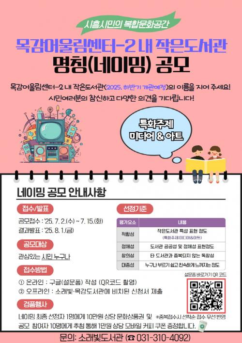 [½Åµ¿¾Æ¹æ¼Û ½ÃÈï½Ã=À̽ŵ¿±âÀÚ] ½ÃÈï½Ã´Â ¿Ã ÇϹݱ⿡ °³°ü ¿¹Á¤ÀÎ ¡®¸ñ°¨¾î¿ï¸²¼¾ÅÍ-2¡¯ ³»¿¡ Á¶¼ºµÇ´Â ÀÛÀºµµ¼­°üÀÇ ¸íĪÀ» 7¿ù 2ÀϺÎÅÍ 15ÀϱîÁö °ø¸ðÇÑ´Ù. ¸ñ°¨¾î¿ï¸²¼¾ÅÍ-2´Â ½ÃÈï½Ã Á¶³²µ¿ 674¹øÁö ÀÏ´ë¿¡ ÃÑ ¿¬¸éÀû 6,724.02§³(ÁöÇÏ 1Ãþ~Áö»ó 3Ãþ)ÀÇ ±Ô¸ð·Î ¡¦