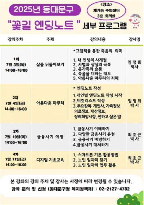 [½Åµ¿¾Æ¹æ¼Û µ¿´ë¹®±¸=À̽ŵ¿±âÀÚ] ¼­¿ï µ¿´ë¹®±¸´Â 7¿ùºÎÅÍ 11¿ù±îÁö ÃÑ 4±â¿¡ °ÉÃÄ °ü³» ¾î¸£½ÅµéÀ» ´ë»óÀ¸·Î Á¸¾öÇÑ Àλý ¸¶¹«¸®¸¦ ÁغñÇÒ ¼ö ÀÖ´Â ¡®²É±æ ¿£µù³ëÆ®¡¯ À£´ÙÀ× °­Á¸¦ ÁøÇàÇÑ´Ù°í ¹àÇû´Ù. 7¿ù 3, 4ÀÏ¿¡ Á¦±âµ¿Áֹμ¾ÅÍ¿¡¼­ ÀÓÁ¤Èñ½É¸®»ó´ã¼¾ÅÍ ÀÓÁ¤¡¦