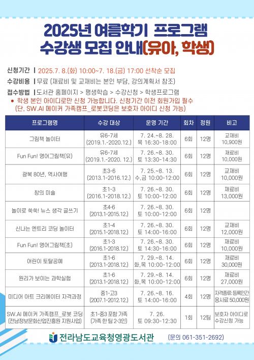 [½Åµ¿¾Æ¹æ¼Û Àü³²¿µ±¤=À̽ŵ¿±âÀÚ] Àü¶ó³²µµ±³À°Ã»¿µ±¤µµ¼­°üÀº À¯¾Æ, ÇлýÀ» ´ë»óÀ¸·Î 7¿ù 18ÀϱîÁö 2025³â ¿©¸§Çб⠵µ¼­°ü ÇÁ·Î±×·¥ ¼ö°­»ýÀ» ¸ðÁýÇÑ´Ù. ÁÖ¿ä ÇÁ·Î±×·¥Àº À¯¾Æ ¹× ÃʵîÇлý ´ë»ó, ±×¸²Ã¥ ³îÀÌÅÍ, Fun Fun! ¿µ¾î±×¸²Ã¥, ±¤º¹80³â ¿ª»ç¿©Çà, ³îÀÌ¡¦