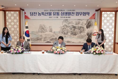 [½Åµ¿¾Æ¹æ¼Û=ÀÌÀçö±âÀÚ] ´çÁø½Ã(½ÃÀå ¿À¼ºÈ¯)´Â 7¿ù 21ÀÏ ´çÁø½Ãû ÇØ³ª·çȦ¿¡¼­ Çѱ¹³ó¼ö»ê½ÄǰÀ¯Åë°ø»ç(aT) ¹× CJÇÁ·¹½Ã¿þÀÌ ÇÔ²²¡®´çÁø½Ã ³óƯ»ê¹° À¯Åë Ȱ¼ºÈ­¸¦ À§ÇÑ »ó»ý¹ßÀü ¾÷¹«Çù¾à¡¯À» ü°áÇß´Ù°í ¹àÇû´Ù. À̳¯ Çù¾à½Ä¿¡´Â ¿À¼ºÈ¯ ´çÁø½ÃÀåÀ» ºñ·ÔÇØ Çѱ¹¡¦