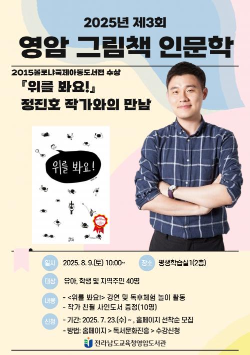 [½Åµ¿¾Æ¹æ¼Û Àü³²¿µ¾Ï=À̽ŵ¿±âÀÚ] Àü¶ó³²µµ±³À°Ã»¿µ¾Ïµµ¼­°ü(±¸. ¿µ¾Ï°ø°øµµ¼­°ü)Àº ¿À´Â 8¿ù 9ÀÏ(Åä) ¿ÀÀü 10½Ã, 2025³â Á¦3ȸ ¿µ¾Ï ±×¸²Ã¥ Àι®ÇÐ Á¤ÁøÈ£ ÀÛ°¡¿ÍÀÇ ¸¸³²À» ¿î¿µÇÑ´Ù. À̹ø °­¿¬Àº ¼¼°è 3´ë ¾Æµ¿µµ¼­»ó Áß ÇϳªÀÎ º¼·Î³Ä ±¹Á¦¾Æµ¿µµ¼­Àü ¶ó°¡Ä¡»ó ¡¦