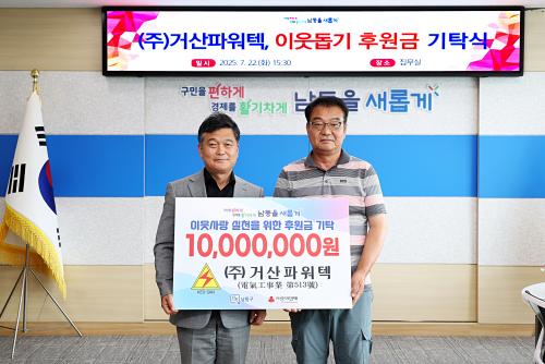 [½Åµ¿¾Æ¹æ¼Û ÀÎõ= À±¹Î½Ä ±âÀÚ]ÀÎõ½Ã ³²µ¿±¸´Â ÁÖ½Äȸ»ç °Å»êÆÄ¿öÅØ(´ëÇ¥ ±è±ÝÀÚ)·ÎºÎÅÍ ÀÌ¿ôµ½±â¸¦ À§ÇÑ ¼º±Ý 1õ¸¸ ¿øÀ» ±âŹ¹Þ¾Ò´Ù°í 25ÀÏ ÀüÇß´Ù. ±âºÎ±ÝÀº »çȸº¹Áö½Ã¼³ ¹× ´Üü¿¡ 500¸¸ ¿ø, ³íÇöÁ¾ÇÕ»çȸº¹Áö°ü¿¡ 500¸¸ ¿ø¾¿ °¢°¢ Àü´ÞµÅ Ãë¾à°èÃþ Áö¿ø°ú ¡¦