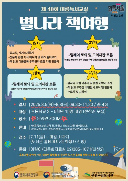 [½Åµ¿¾Æ¹æ¼Û ÀºÆò±¸=À̽ŵ¿±âÀÚ] ¼­¿ï ÀºÆò±¸ ÀºÆò±¸¸³µµ¼­°üÀº ¿©¸§¹æÇÐÀ» ¸Â¾Æ ³»´Þ 5ÀϺÎÅÍ 8ÀϱîÁö ÃʵîÇб³ 3~5ÇгâÀ» ´ë»óÀ¸·Î Á¦40ȸ ¿©¸§ µ¶¼­ ±³½Ç ¡®º°³ª¶ó Ã¥ ¿©Ç࡯À» ¿î¿µÇÑ´Ù°í ¹àÇû´Ù. À̹ø µ¶¼­±³½ÇÀº ±¹¸³¾î¸°ÀÌû¼Ò³âµµ¼­°üÀÌ ÁÖ°üÇϰí Áö¿ª °ø°øµµ¡¦