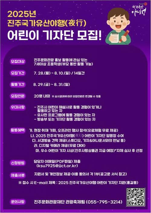 [½Åµ¿¾Æ¹æ¼Û °æ³²ÁøÁÖ=³²±Ã¿µ±â±âÀÚ] ÁøÁÖ½Ã¿Í ÁøÁÖ¹®È­°ü±¤Àç´ÜÀº ¿À´Â 8¿ù29ÀÏ(±Ý)ºÎÅÍ 31ÀÏ(ÀÏ)±îÁö 3ÀÏ µ¿¾È °³ÃֵǴ ¡®2025. ÁøÁÖ±¹°¡À¯»ê¾ßÇà(å¨ú¼)¡¯Çà»ç¿¡ ¾î¸°ÀÌ ±âÀÚ´ÜÀ» ¸ðÁýÇÑ´Ù. À̹ø ±âÀÚ´ÜÀº ¾ßÇà ÇöÀåÀÇ ´Ù¾çÇÑ Ã¼Çè°ú Çà»ç¸¦ ¾î¸°ÀÌÀÇ ½Ã°¢À¸·Î ÃëÀ硦