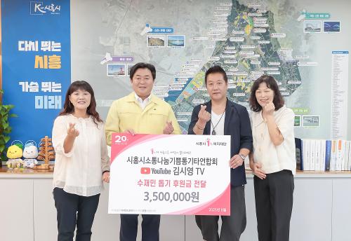 [½Åµ¿¾Æ¹æ¼Û ½ÃÈï½Ã=À̽ŵ¿±âÀÚ] ½ÃÈï½Ã´Â Áö³­ 8¿ù 11ÀÏ ¼Ò³ª±âÅë±âŸ¿¬ÇÕȸ(¼ÒÅë¤ý³ª´®¤ý±â»Ý)¿Í À¯Æ©ºê ä³Î ¡®±è½Ã¿µTV¡¯°¡ ½ÃÈï½Ã1%º¹ÁöÀç´Ü(ÀÌÇÏ, º¹ÁöÀç´Ü)À» ÅëÇØ ¼öÀç¹Î Áö¿øÀ» À§ÇÑ ÈÄ¿ø±Ý 350¸¸ ¿øÀ» ±âŹÇß´Ù°í ¹àÇû´Ù. À̳¯ Àü´Þ¹ÞÀº ÈÄ¿ø±Ý Àü¾×Àº ÃÖ±Ù¡¦