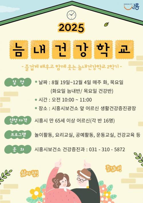 [½Åµ¿¾Æ¹æ¼Û ½ÃÈï½Ã=À̽ŵ¿±âÀÚ] ½ÃÈï½Ã´Â ¾î¸£½ÅµéÀÇ ½Åü ¹× ÀÎÁö °Ç°­À» ÁõÁøÇϰí Ȱ±âÂù ³ëÈĸ¦ Áö¿øÇϱâ À§ÇÑ ´Æ³»°Ç°­Çб³ 2Çбâ ÇÁ·Î±×·¥À» ¿À´Â 8¿ù 19ÀϺÎÅÍ ½ÃÀÛÇÑ´Ù. ´Æ³»°Ç°­Çб³´Â ÀÎÁö °Ç°­ Ȱµ¿°ú »çȸÀû ±³·ù ÁõÁøÀ¸·Î Ä¡¸Å ¿¹¹æ ¹× ¿ì¿ï°¨¤ý°í¸³°¨ ¡¦