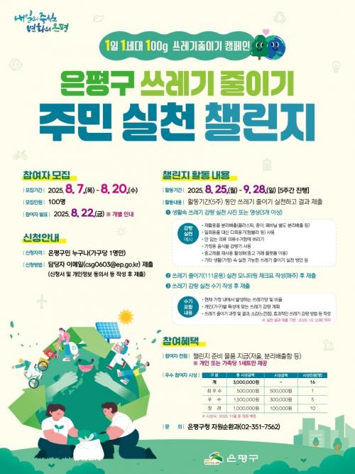 [½Åµ¿¾Æ¹æ¼Û ÀºÆò±¸=À̽ŵ¿±âÀÚ] ¼­¿ï ÀºÆò±¸´Â Áö³­ 7ÀϺÎÅÍ Áֹΰú ÇÔ²²ÇÏ´Â ¡®¾²·¹±â ÁÙÀ̱â ÁֹΠ½Çõ 縰Áö¡¯¸¦ ÁøÇàÇϰí ÀÖ´Ù°í ¹àÇû´Ù. À̹ø 縰Áö´Â »ýȰ ¼Ó ¾²·¹±â °¨·® ¹®È­¸¦ È®»êÇϰí, °¡±¸ Ư¼º¿¡ ¸Â´Â °¨·® ¹æ¹ýÀ» °øÀ¯ÇØ ´õ ¸¹Àº ÁÖ¹ÎÀÌ ¾²·¹±â ÁÙÀÌ¡¦