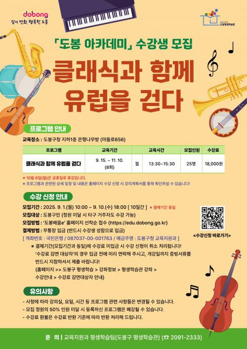 [½Åµ¿¾Æ¹æ¼Û µµºÀ±¸=À̽ŵ¿±âÀÚ] ¼­¿ï µµºÀ±¸°¡ 9¿ù 1ÀϺÎÅÍ 10ÀϱîÁö À¯·´ÀÇ À½¾Ç°ú ¹®È­¸¦ ¹è¿ï ¼ö ÀÖ´Â 'Ŭ·¡½Ä°ú ÇÔ²² À¯·´À» °È´Ù' °­Á Âü¿©ÀÚ¸¦ ¸ðÁýÇÑ´Ù. À̹ø °­Á´ µµºÀ±¸Ã» ÁöÇÏ1Ãþ ÀºÇ೪¹«¹æ¿¡¼­ 9¿ù 15ÀϺÎÅÍ 11¿ù 10ÀϱîÁö ¸ÅÁÖ ¿ù¿äÀÏ ÃÑ 8ȸÂ÷·Î Áø¡¦