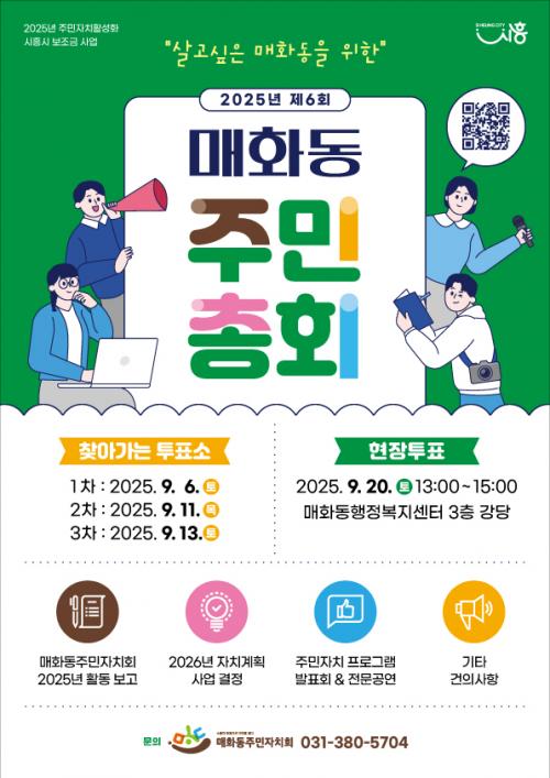 [½Åµ¿¾Æ¹æ¼Û ½ÃÈï½Ã=À̽ŵ¿±âÀÚ] ¸ÅÈ­µ¿ ÁÖ¹ÎÀÚġȸ(ȸÀå ±èÁ¤Àº)´Â 9¿ù 20ÀÏ 13½ÃºÎÅÍ 15½Ã±îÁö ¸ÅÈ­µ¿ ÇàÁ¤º¹Áö¼¾ÅÍ3Ãþ °­´ç¿¡¼­ 2025³â Á¦6ȸ ¸ÅÈ­µ¿ ÁÖ¹ÎÃÑȸ¸¦ °³ÃÖÇÑ´Ù. ÁÖ¹ÎÃÑȸ´Â ÁֹΠ½º½º·Î ¹ß±¼ÇÑ ÀÇÁ¦¸¦ ´õ ¸¹Àº Áֹΰú ÇÔ²² °øÀ¯Çϰí ÀǰßÀ» ¼ö·ÅÇϱ⠡¦