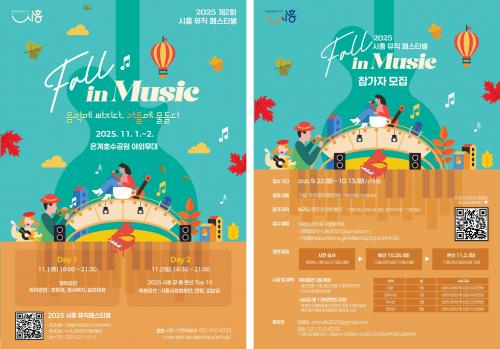 [½Åµ¿¾Æ¹æ¼Û ½ÃÈï½Ã=À̽ŵ¿±âÀÚ] ½ÃÈï½Ã´Â ¿À´Â 11¿ù 1ÀϺÎÅÍ 2ÀϱîÁö ½ÃÈï Àº°èÈ£¼ö°ø¿ø¿¡¼­ ¡®2025³â Á¦2ȸ ½ÃÈï¹ÂÁ÷Æä½ºÆ¼¹ú¡¯ °³ÃÖ¸¦ ¾ÕµÎ°í Âü°¡ÆÀÀ» ¸ðÁýÇÑ´Ù. ¿ÃÇØ Æä½ºÆ¼¹ú ÁÖÁ¦´Â ¡®½ÃÈï Fall in Music -À½¾Ç¿¡ ºüÁö´Ù, °¡À»¿¡ ¹°µé´Ù- ¡¯·Î ¡®°¡À»¡¯À» ÁÖÁ¦·Î¡¦