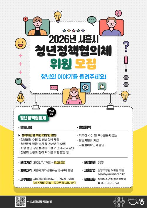[½Åµ¿¾Æ¹æ¼Û ½ÃÈï½Ã=À̽ŵ¿±âÀÚ] ½ÃÈï½Ã´Â 2026³â ÇÑ ÇØ µ¿¾È Ȱµ¿ÇÒ Á¦10±â ½ÃÈï½Ã û³âÁ¤Ã¥ÇùÀÇü ½Å±Ô À§¿ø 25¸íÀ» °ø°³ ¸ðÁýÇÑ´Ù. ½Åû ±â°£Àº 11¿ù 17ÀϺÎÅÍ 28ÀϱîÁöÀ̸ç, ½ÃÈï½Ã¿¡ °ÅÁÖÇϰųª »ýȰÇÏ´Â ¸¸ 19¼¼~39¼¼ û³âÀÌ¸é ´©±¸³ª Áö¿øÇÒ ¼ö ÀÖ´Ù. ÇùÀÇü¡¦