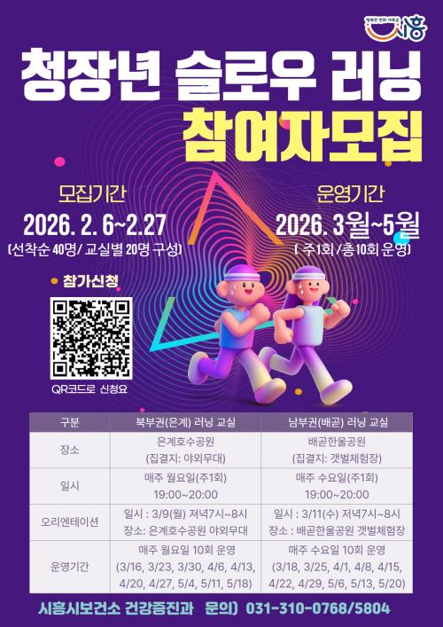 [½Åµ¿¾Æ¹æ¼Û ½ÃÈï½Ã=À̽ŵ¿±âÀÚ] ½ÃÈï½Ã´Â ûÀå³âÃþÀÇ Ã¼·Â ÁõÁø°ú Ȱ±âÂù ÀÏ»óÀ» µ½±â À§ÇØ ¡®Ã»Àå³â ½½·Î¿ì ·¯´× ±³½Ç¡¯ Âü¿©ÀÚ¸¦ ¸ðÁýÇÑ´Ù. À̹ø ÇÁ·Î±×·¥Àº ±âÁ¸ °È±â ±³½Çº¸´Ù ÇÑ ´Ü°è ¹ßÀüÇÑ ½ÅüȰµ¿ ÇÁ·Î±×·¥À¸·Î, °³ÀΠü·Â ¼öÁØ¿¡ ¸ÂÃç õõÈ÷ ´Þ¸®´Â ¡®½½¡¦