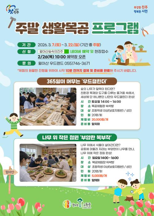 [½Åµ¿¾Æ¹æ¼Û °æ³²ÁøÁÖ=±è¸í¼ö±âÀÚ] ÁøÁֽô 2026³â ÇÑ ÇØ µ¿¾È ¡®¿ù¾Æ»ê ½£¼ÓÀÇ ÁøÁÖ¡¯¿¡¼­ ½Ã¹ÎÀ» ´ë»óÀ¸·Î ½Ç»ýȰ¿¡ Ȱ¿ëÀÌ °¡´ÉÇÑ ´Ù¾çÇÑ ¸ñ°ø üÇè ÇÁ·Î±×·¥À» ¿î¿µÇÒ °èȹÀ̶ó°í ¹àÇû´Ù. ¸ÕÀú, ¿À´Â 3¿ù 7ÀϺÎÅÍ 22ÀϱîÁö ÁÖ¸»¸¶´Ù ¡®ÁÖ¸» »ýȰ¸ñ°ø¡¯À» ¿î¿µÇÏ¡¦