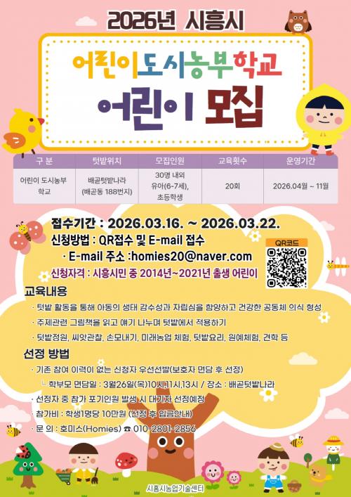 [½Åµ¿¾Æ¹æ¼Û ½ÃÈï½Ã=À̽ŵ¿±âÀÚ] ½ÃÈï½Ã´Â ¾î¸°À̵鿡°Ô »ý¸í³ó¾÷ ÀÚ¿øÀ» Ȱ¿ëÇÑ ÀÚ¿¬Ä£È­Àû ³ó¾÷ üÇè ±âȸ¸¦ Á¦°øÇØ À¯³â±â °Ç°­ÇÑ ¼ºÀåÀ» µ½±â À§ÇÑ ¡®2026³â ¾î¸°ÀÌ µµ½Ã³óºÎÇб³¡¯¸¦ 4¿ùºÎÅÍ 11¿ù±îÁö ¹è°ðÅԹ糪¶ó¿¡¼­ ¿î¿µÇÑ´Ù. À̹ø »ç¾÷Àº ÅÔ¹ç Ȱµ¿À» ÅëÇØ¡¦