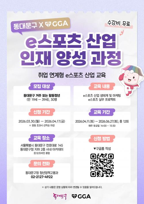 [½Åµ¿¾Æ¹æ¼Û µ¿´ë¹®±¸=À̽ŵ¿±âÀÚ] ¼­¿ï µ¿´ë¹®±¸´Â ÃֽаæÇâ¿¡ ¸ÂÃç ½Ç¹« Áß½ÉÀÇ e½ºÆ÷Ã÷»ê¾÷ ±³À°À» ÅëÇØ Áö¿ª û³âÀÇ Ãë¾÷ ¿ª·®À» °­È­ÇϰíÀÚ Á¨ÁöÀ̽ºÆ÷Ã÷±Û·Î¹ú¾ÆÄ«µ¥¹Ì¿Í ÇÔ²² ¡®e½ºÆ÷Ã÷»ê¾÷ ÀÎÀç ¾ç¼º ±³À° ÇÁ·Î±×·¥¡¯À» ¿î¿µÇÑ´Ù. ±³À° ³»¿ëÀº e½ºÆ÷Ã÷ »ê¾÷¡¦