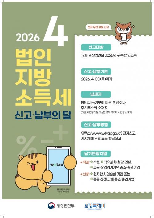 [½Åµ¿¾Æ¹æ¼Û=ÀÌÀçö±âÀÚ] È­¼ºÆ¯·Ê½Ã°¡ 2025³â ±Í¼Ó ¡®¹ýÀÎÁö¹æ¼Òµæ¼¼ ÁýÁß ½Å°í¡¤³³ºÎ ±â°£¡¯À» ¿À´Â 4¿ù 30ÀϱîÁö ¿î¿µÇÑ´Ù°í ¹àÇû´Ù. ¹ýÀÎÁö¹æ¼Òµæ¼¼´Â ¹ýÀÎÀÌ ÇØ´ç »ç¾÷¿¬µµ ¼ÒµæÀ» ±âÁØÀ¸·Î °üÇÒ ½Ã¡¤±º¡¤±¸¿¡ ½Å°í¡¤³³ºÎÇÏ´Â ¼¼±ÝÀÌ´Ù. È­¼º½Ã °ü³»¿¡ »ç¾÷ÀåÀ»¡¦