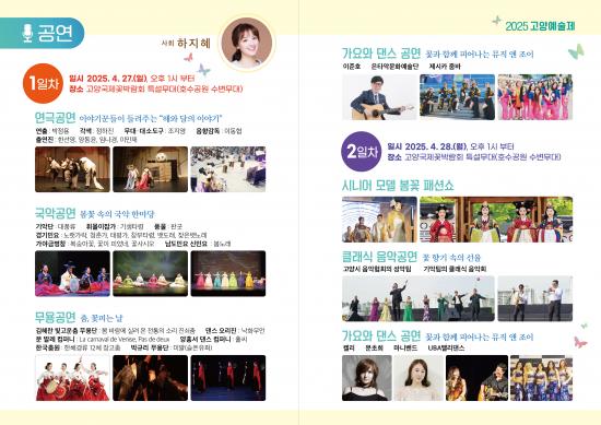 À̹ø °í¾ç¿¹¼úÁ¦¿¡¼­´Â µà¿§ ¸¶´ÏÀÇ °ø¿¬À» ºñ·ÔÇØ Ŭ·¡½Ä À½¾Ç Äܼ­Æ®, °¡¿ä ¹× ´í½º °ø¿¬, ½Ã´Ï¾î ¸ðµ¨ ÆÐ¼Ç¼î µî ´Ùä·Î¿î Çà»ç°¡ ¸¶·ÃµÇ¾î ÀÖ´Ù. ƯÈ÷, Çà»ç Àå¼ÒÀÎ °í¾ç±¹Á¦²É¹Ú¶÷ȸ Ư¼³¹«´ë´Â ²ÉÀÌ ¸¸°³ÇÑ º½ÀÇ Á¤Ãë¿Í ¾î¿ì·¯Á® °ü°´µé¿¡°Ô Ưº°ÇÑ Ãß¾ïÀ» ¼±»çÇÒ Àü¸ÁÀÌ´Ù.