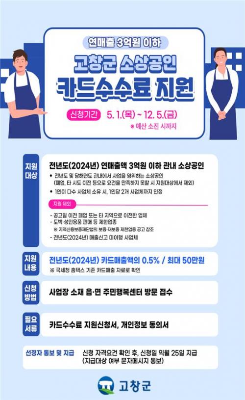 Áö¿ø ´ë»óÀº Àü³âµµ(2024³âµµ) ¿¬¸ÅÃâ 3¾ï¿ø ÀÌÇÏÀÇ °íⱺ ³» ¼Ò»ó°øÀÎÀÌ´Ù. Ä«µå ¸ÅÃâ¾×ÀÇ 0.5%¿¡ ÇØ´çÇÏ´Â Ä«µå¼ö¼ö·á¸¦ ÃÖ´ë 50¸¸¿ø±îÁö Áö¿øÇÑ´Ù.