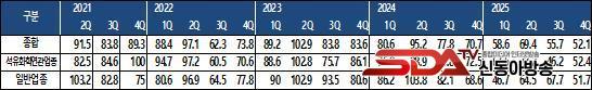 ¾÷Á¾º°·Î »ìÆìº¸¸é, ¼®À¯ÈÇÐ ¿¬°ü¾÷Á¾Àº 52.4·Î Àü ºÐ±â(46.2) ´ëºñ 6.2 Æ÷ÀÎÆ® »ó½ÂÇßÀ¸³ª ¿©ÀüÈ÷ ±âÁØÄ¡¸¦ Å©°Ô ¹Øµ¹¾ÒÀ¸¸ç, ÀÏ¹Ý Á¦Á¶¾÷Àº 51.7·Î Àü ºÐ±â(67.7) ´ëºñ 16.0 Æ÷ÀÎÆ® ±Þ¶ôÇÏ¿© ü°¨°æ±â°¡ ±Þ°ÝÈ÷ ¾ÇÈµÈ °ÍÀ¸·Î Á¶»çµÇ¾ú´Ù.