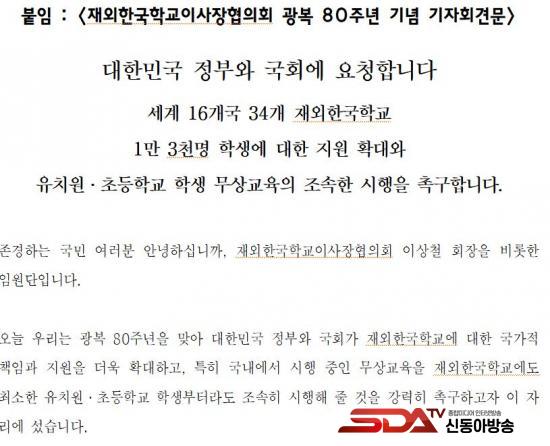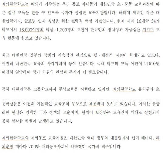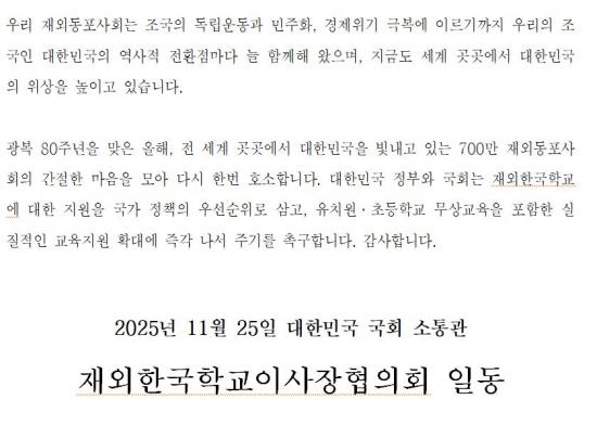 ¡à ÀÌ¿¡ Àç¿ÜÇѱ¹Çб³ÀÌ»çÀåÇùÀÇȸ(ÀÌ»óö ȸÀ塤Áß±¹ ¼ÒÁÖÇѱ¹Çб³ ÀÌ»çÀå)´Â ±âÀÚȸ°ß¿¡¼ ¡°Àç¿ÜÇѱ¹Çб³¿Í Àç¿Üµ¿Æ÷ ±³À°Áö¿øÀº ´ëÇѹα¹ ¿ª´ë Á¤ºÎ¿Í ´ëÅë·É²²¼ ÇØ¿Ü ¼ø¹æ ¶§¸¶´Ù 700¸¸ Àç¿Üµ¿Æ÷»çȸ¿¡ ¾à¼ÓÇØ ¿Â ±¹°¡Àû Ã¥¹«¡±¶ó¸ç ¡°À¯Ä¡¿ø°ú ÃʵîÇб³ºÎÅÍ ´Ü°èÀûÀ¸·Î ¹«»ó±³À°¡¤¹«»ó±Þ½ÄÀ» µµÀÔÇϰí, ³ëÈÄÈµÈ ±³À°È¯°æÀ» ȹ±âÀûÀ¸·Î °³¼±ÇÏ´Â µî Àç¿ÜÇѱ¹Çб³¿Í Àç¿Üµ¿Æ÷±³À°ÀÌ ³»½ÇÀÖ°Ô ¿î¿µµÉ ¼ö ÀÖµµ·Ï Á¤ºÎ¿Í ±¹È¸°¡ Àû±ØÀûÀ¸·Î ³ª¼´Þ¶ó¡±°í Ã˱¸Çß´Ù.
