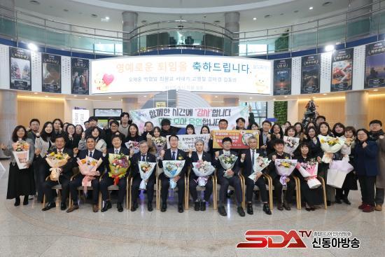 À̹ø ÅðÀÓ½ÄÀº ¿ÀÁ¦È« ȯ°æ±¹Àå, ¹ÚÇüÀÏ µ¿ºÎÃâÀå¼ÒÀå, ÃÖ¿ø±³ °¨»ç°üÀ» ºñ·ÔÇÑ 9¸íÀÇ ÅðÁ÷ÀÚ ¹× °¡Á·°ú µ¿·á, ¼±ÈÄ¹è °øÁ÷ÀÚµéÀÌ ÇÔ²²ÇÑ °¡¿îµ¥ ¡ãÀλç¹ß·ÉÅëÁö¼ ±³ºÎ ¹× °ø·ÎÆÐ ¼ö¿© ¡ã±â³ä¿µ»ó ¹× ÃàÇϰø¿¬ ¡ãÅðÀÓ»ç µîÀ¸·Î ÁøÇàµÇ¾úÀ¸¸ç, Âü¼®ÀÚµéÀº µû¶æÇÑ ºÐÀ§±â ¼Ó¿¡¼ ÅðÁ÷ÀÚµéÀÇ ³ë°í¸¦ µÇ»õ°å´Ù.