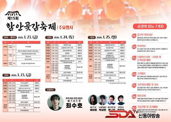 ÃàÁ¦ ù³¯ÀÎ 23ÀÏ(±Ý)¿¡´Â ¿ÀÈÄ 1½Ã 45ºÐ ¾Æ¶ó¾Ó»óºíÀÇ ½ÄÀü °ø¿¬À» ½ÃÀÛÀ¸·Î °³¸·½Ä°ú ´Ù¾çÇÑ Ã¼ÇèÇà»ç, Á÷°Å·¡ÀåÅͰ¡ ¿­¸®¸ç ¿ÀÈÄ 5½Ã¿¡ Çà»ç°¡ ¸¶¹«¸®µÈ´Ù. 24ÀÏ(Åä)¿¡´Â ¡®³ë·¡°¡ ÁÁ´Ù¡¯ÀÇ ¹Ú»óÇö°ú ¡®¹Ì½ºÆ®·Ô¡¯ Ãâ½Å Á¦À̸°ÀÌ, 25ÀÏ(ÀÏ)¿¡´Â ±¹¾Ç°¡¼ö ȲÀÎ¾Æ¿Í ¡®¹Ì½ºÅÍÆ®·Ô¡¯ Ãâ½Å ÃÖ¼öÈ£°¡ ÃàÇϰø¿¬À» ÆîÃÄ ÃàÁ¦ ºÐÀ§±â¸¦ ÇÑÃþ µ¸¿ï °èȹÀÌ´Ù. ƯÈ÷ ÇԾȰù°¨ÃàÁ¦ÀÇ ´ëÇ¥ Çà»çÀÎ ¡®°ù°¨¸»À̶± ¸¸µé±â¡¯ Çà»ç¿Í ¡®°ù°¨ ³ë·¡ÀÚ¶û ´ëȸ¡¯´Â ÇØ¸¶´Ù ¸¹Àº Áö¿ª¹ÎÀÇ »ç¶ûÀ» ¹Þ°í ÀÖ´Ù.