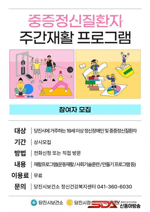 ´çÁø½Ã¹Î Áß Á¤½Å°ú ¾à¹°À» º¹¿ëÇϰí ÀçȰ¿¡ ´ëÇÑ ÀÇÁö°¡ ÀÖ´Ù¸é ´©±¸³ª Âü¿©ÇÒ ¼ö ÀÖÀ¸¸ç, ´çÁø½Ãº¸°Ç¼Ò Á¤½Å°Ç°º¹Áö¼¾ÅÍ(¢Ï360-6030)·Î ÀüÈÇϰųª ¹æ¹®ÇØ ½ÅûÇÒ ¼ö ÀÖ´Ù. ÀÚ¼¼ÇÑ »çÇ×Àº ´çÁø½ÃÁ¤½Å°Ç°º¹Áö¼¾ÅÍ ´©¸®Áý(http://dangjin.chmhc.or.kr)À» Âü°íÇÏ¸é µÈ´Ù.