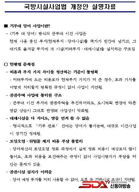 ´õºÒ¾î¹ÎÁÖ´ç ¹Ú¼±¿ø ±¹È¸ÀÇ¿ø(ÀÎõ ºÎÆò±¸À»/±¹¹æÀ§¿øÈ¸)Àº ±º»ç½Ã¼³ ÀÌÀü »ç¾÷À» º¸´Ù ºü¸£°í Çö½ÇÀûÀ¸·Î ÃßÁøÇϱâ À§ÇÑ ¡¸±¹¹æ¡¤±º»ç½Ã¼³ »ç¾÷¿¡ °üÇÑ ¹ý·ü ÀϺΰ³Á¤¹ý·ü¾È¡¹°ú ¡¸±¹À¯Àç»êƯ·ÊÁ¦Çѹý ÀϺΰ³Á¤¹ý·ü¾È¡¹À» ´ëÇ¥¹ßÀÇÇß´Ù.
