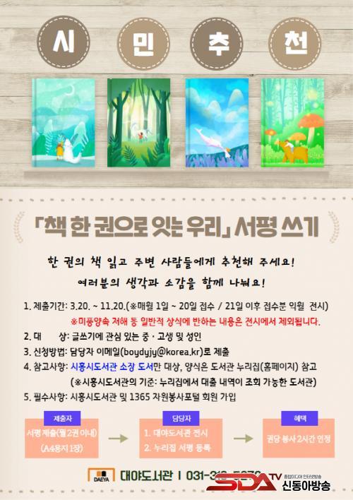 À̹ø ¼Æò ¾²±â´Â ½ÃÈï½Ãµµ¼°üÀÇ ¼ÒÀå µµ¼¸¦ ÀÐ°í ´À³¤ Á¡°ú Ãßõ ÀÌÀ¯¸¦ ÀÚÀ¯·Ó°Ô ÀÛ¼ºÇØ °øÀ¯ÇÏ´Â Âü¿©Çü µ¶¼ Ȱµ¿ÀÌ´Ù. Áß°íµîÇлý°ú ¼ºÀÎ ´©±¸³ª Âü¿©ÇÒ ¼ö ÀÖÀ¸¸ç, °³Àκ° ¿ù 1ÀÎ 2±Ç±îÁö Á¦ÃâÇÒ ¼ö ÀÖ´Ù.