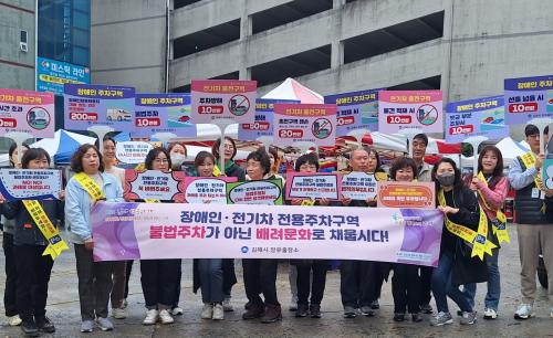 [½Åµ¿¾Æ¹æ¼Û´º½º=ÃÖ¼ÛÈ­±âÀÚ] ±èÇØ½Ã ÀåÀ¯ÃâÀå¼Ò(¼ÒÀå ÇÑÈçÈñ)´Â Áö³­ 6ÀÏ ¿ÀÀÏÀåÀÌ ¿­¸° Á©¹Ì½ÃÀå ÀÏ¿ø¿¡¼­ ±èÇØ½Ã±âÈÄ․ȯ°æ³×Æ®¿öÅ© ȸ¿ø 20¿©¸í°ú ÇÔ²² ¡®Àå¾ÖÀÎ・Àü±âÂ÷ Àü¿ëÁÖÂ÷±¸¿ª ºÒ¹ýÁÖÁ¤Â÷ ±ÙÀý¡¯À» À§ÇÑ ¹Î°ü ÇÕµ¿ Ä·ÆäÀÎÀ» ½Ç½ÃÇß´Ù°í 7ÀÏ ¹àÇû¡¦