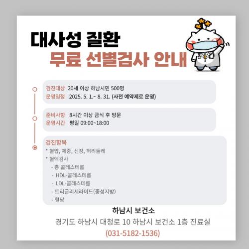 [½Åµ¿¾Æ¹æ¼Û Çϳ²½Ã=À̽ŵ¿±âÀÚ] Çϳ²½Ã´Â ½Ã¹ÎÀÇ °Ç°­ÇÑ »îÀ» Áö¿øÇÏ°í ´ë»çÁõÈıºÀ» ºñ·ÔÇÑ ¸¸¼ºÁúȯ ¿¹¹æ°ü¸®¸¦ °­È­Çϱâ À§ÇØ, ¿À´Â 5¿ù 1ÀϺÎÅÍ 8¿ù 31ÀϱîÁö ´ë»ç¼º Áúȯ ¹«·á ¼±º°°Ë»ç¸¦ ½Ç½ÃÇÑ´Ù°í ¹àÇû´Ù. À̹ø °Ë»ç´Â °Ç°­¿¡ Å« ¿µÇâÀ» ¹ÌÄ¡Áö¸¸ Ãʱ⿡´Â ¡¦