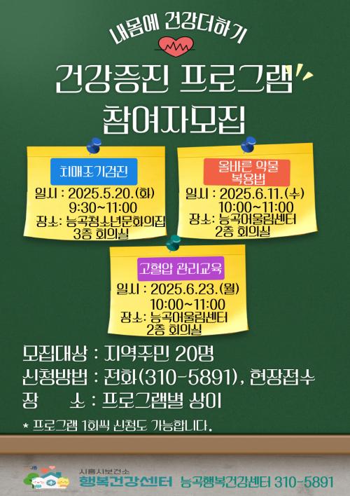 [½Åµ¿¾Æ¹æ¼Û ½ÃÈï½Ã=À̽ŵ¿±âÀÚ] ½ÃÈï½Ã´É°îÇູ°Ç°­¼¾ÅÍ´Â 5¿ù 20ÀϺÎÅÍ 6¿ù 23ÀϱîÁö 3Â÷·Ê¿¡ °ÉÃÄ Áö¿ªÁÖ¹ÎÀÇ °Ç°­ÇÑ ÀÏ»óÀ» Áö¿øÇÏ´Â ¸ÂÃãÇü °Ç°­°­Á ¡®³» ¸ö¿¡ °Ç°­ ´õÇϱ⡯¸¦ ¿î¿µÇÑ´Ù. °¢ °­Á´ ¼±Âø¼øÀ¸·Î 20¸í¾¿ ¸ðÁýÇϸç, Áö¿ªÁÖ¹ÎÀÇ Áúȯ ¿¹¹æ°ú °Ç°­°ü¡¦